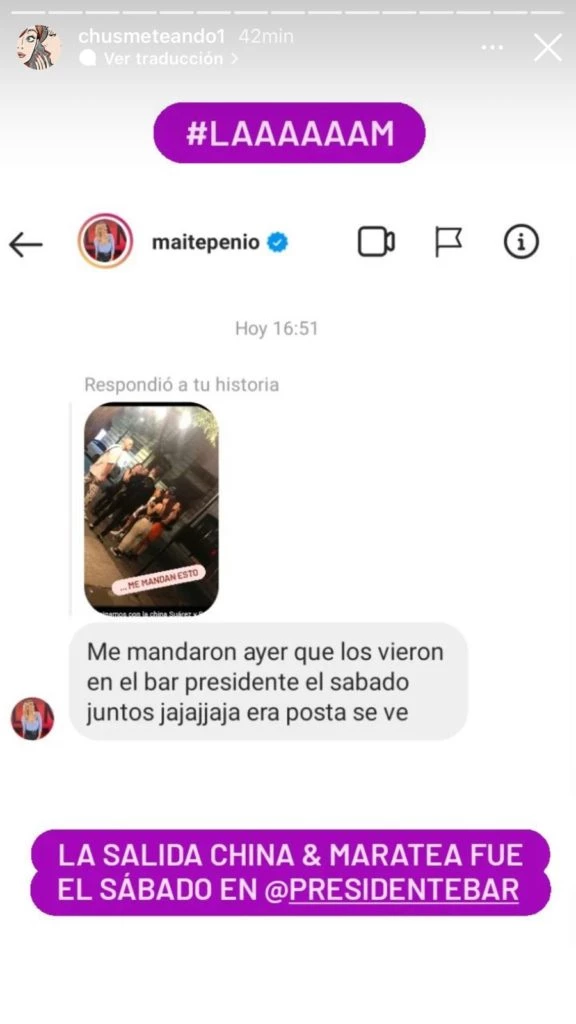 Tras esta publicación, la periodista y 'angelita' Maite Peñoñori confirmó el lugar donde fueron vistos el sábado."Me mandaron que los vieron en el bar Presidente el sábado juntos jajaja era posta se ve", le escribió la panelista a la instagramer.