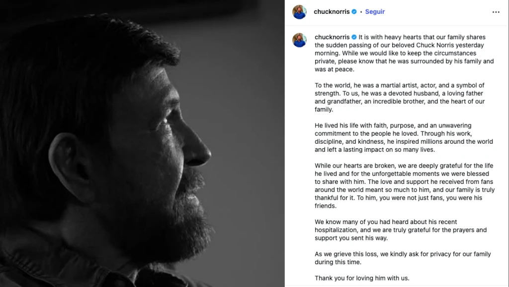 "Con el corazón lleno de pesar, nuestra familia comparte el repentino fallecimiento de nuestro amado Chuck Norris, ocurrido ayer por la mañana. Aunque nos gustaría mantener las circunstancias en privado, por favor sepan que estuvo rodeado de su familia y que se fue en paz.