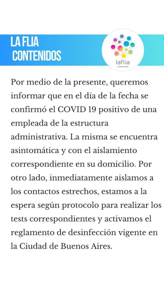 "Por otro lado, inmediatamente aislamos a los contactos estrechos, estamos a la espera según protocolo para realizar los test correspondientes y activamos el reglamento de desinfección vigente en la Ciudad de Buenos Aires", concluía el breve comunicado emitido por la productora.