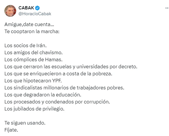 Días atrás Horacio Cabak había realizado una serie de publicaciones desde su cuenta de X (ex Twitter) en las cuales se mostró en contra de la movilización que se realizó en todo el país el martes pasado.