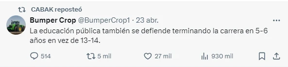 De hecho, una de sus publicaciones fue reposteada por el presidente Javier Milei. Ese posteo decía: “Amigue, date cuenta... Te cooptaron la marcha: los socios de Irán, los amigos del chavismo, los cómplices de Hamas, los que cerraron las escuelas y universidades por decreto, los que se enriquecieron a costa de la pobreza, los que hipotecaron YPF, los sindicalistas millonarios de trabajadores pobres, los que degradaron la educación, los procesados y condenados por corrupción, los jubilados de privilegio. Te siguen usando. Fijate”.