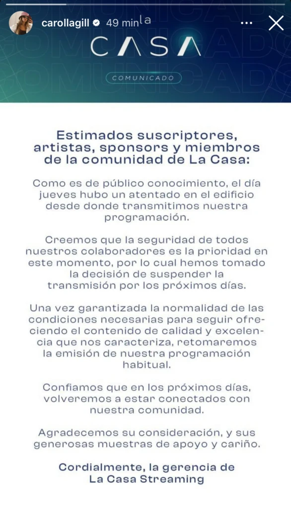 "Estimados suscriptores, artistas, sponsors y miembros de la comunicad de La Casa: como es de público conocimiento, el día jueves hubo un atentado en el edificio desde donde transmitimos nuestra programación", comenzaron diciendo desde la gerencia del mencionado canal de streaming este lunes a la mañana a través de un comunicado.