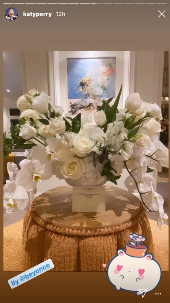 Por otro lado Beyoncé, madre de Blue Ivy Carter (fruto de su relación con Jay Z), le obsequió a su amiga y colega un enorme arreglo con flores blancas, protagonista del living de su casa en Beverly Hills, Los Angeles. La misma residencia donde se había comentado que transformó el parking de tres coches en un vestidor.