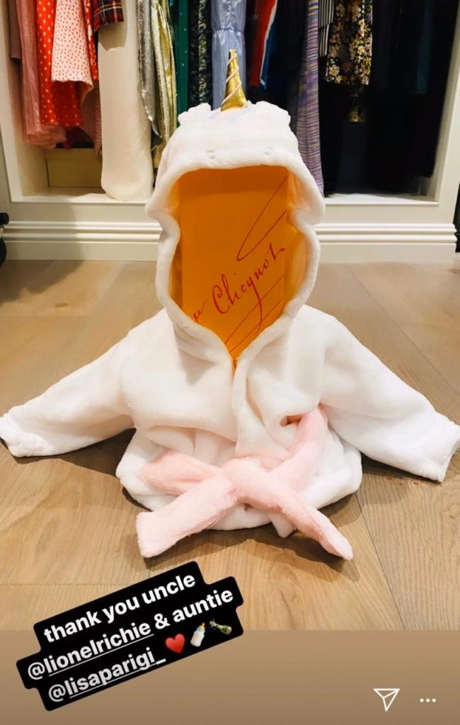 Anoche, Perry también compartió algunos de los regalos que le enviaron sus amistades célebres. Por un lado el tío de la criatura, Lionel Richie, y su pareja, Lisa Parigi, le regalaron un piyama unicornio con un particular gesto para felicitar a los flamantes padres: una botella de champagne Veuve Clicquot.