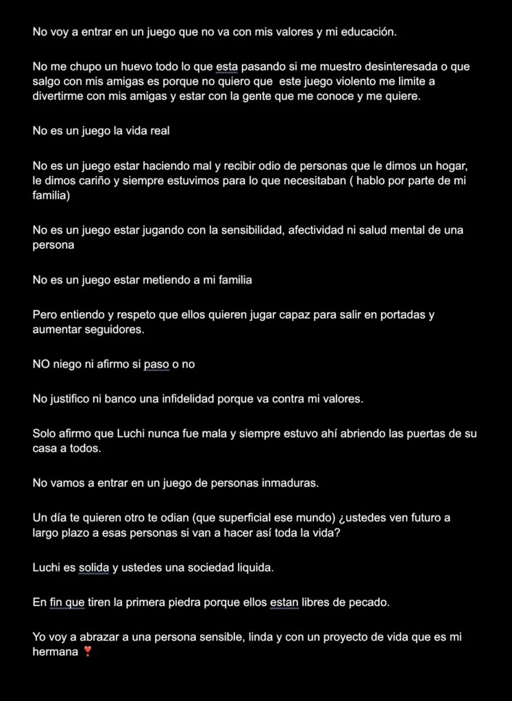 "Luchi es sólida y ustedes una sociedad líquida. En fin, que tiren la primera piedra porque ellos están libres de pecado. Yo voy a abrazar a una persona sensible, linda y con un proyecto de vida, que es mi hermana", concluyó escribiendo la confidente de Lucía.
