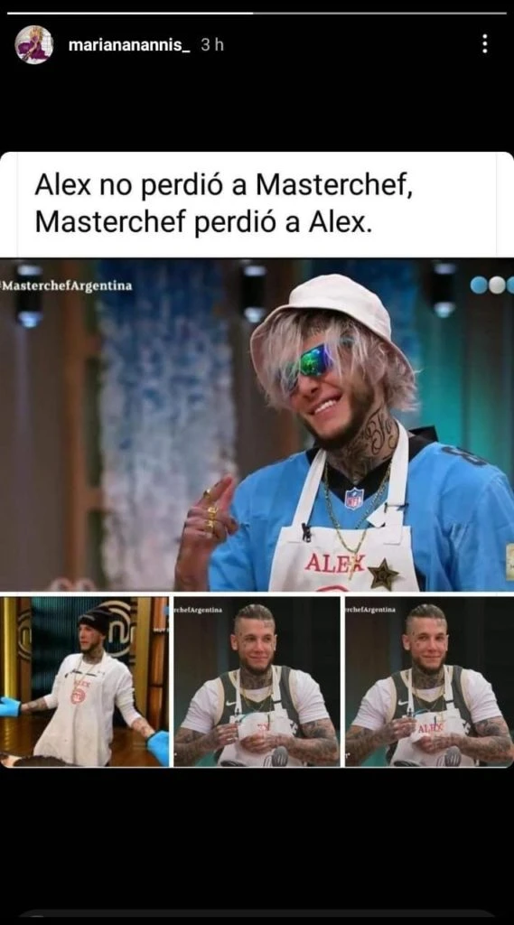 De tal palo, tal astilla. Su madre no se quedó callada y utilizó las redes sociales para hablar sobre su hijo y todo lo vivido en el certamen gastronómico. A través de sus historias de Instagram, Mariana Nannis publicó un collage con distintas imágenes de Alex en el programa y escribió la frase: “Alex no perdió Masterchef, Masterchef perdió a Alex”.