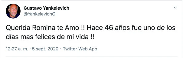 Pero no fue el único recuerdo, claro. Desde la red social Twitter, su padre, Gustavo Yankelevich (70), también se asoció a la fecha escribiéndole unas líneas: “Querida Romina, ¡¡te amo!! Hace 46 años fue uno de los días más felices de mi vida”, le dedicó a pura ternura.