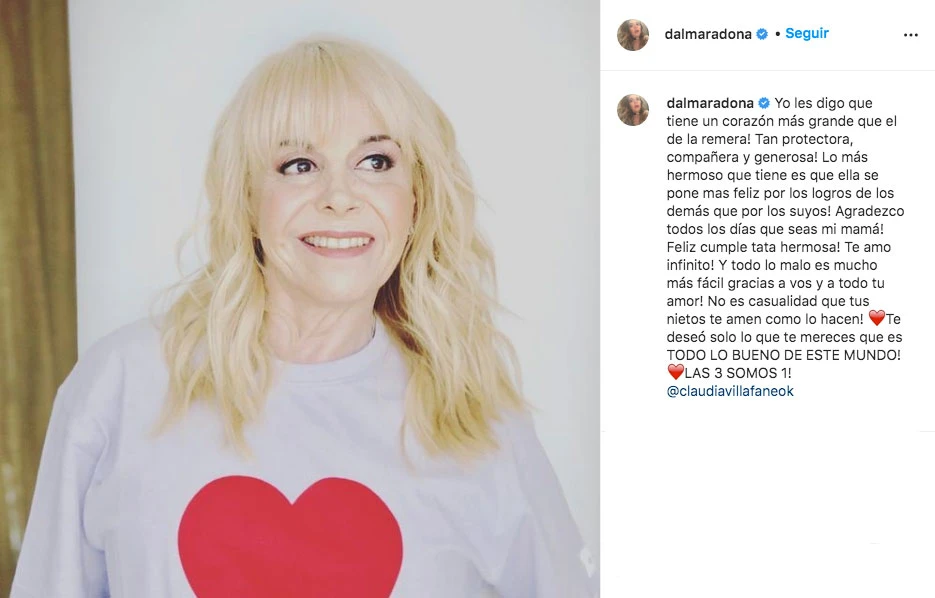 Claudia Villafañe cumple este 22 de enero 59 años y desde las redes sociales, Dalma (33) y Gianinna Maradona (31) le dedicaron sentidos posteos a su mamá, a quién calificaron como "la mejor mamá del universo".