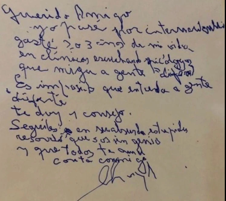La sonrisa de Maradona pronto se convirtió en reflexión frente al primer párrafo de Charly: “Yo pasé por internaciones en las que gasté dos o tres años de mi vida, en clínicas, escuchando a psicólogos que niegan a 'gente diferente'. Es imposible que entiendan a 'gente diferente'", señalaba antes del remate, que emocionó al ex futbolista: “Te doy un consejo: seguirlos es una absurda estupidez y recordá que sos un genio y que todos te aman. Contá conmigo. Charly”, cerró el artista.