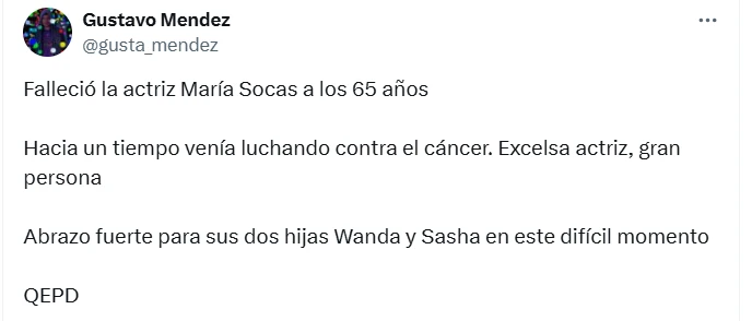 "Falleció la actriz María Socas a los 65 años. Hacía un tiempo venía luchando contra el cáncer. Excelsa actriz, gran persona. Abrazo fuerte para sus dos hijas Wanda y Sasha en este difícil momento. QEPD", comunicó el periodista Gustavo Méndez a través de su cuenta de X (ex Twitter) poco después de las 23 horas de este martes, dando a conocer así la causa del deceso de la artista.