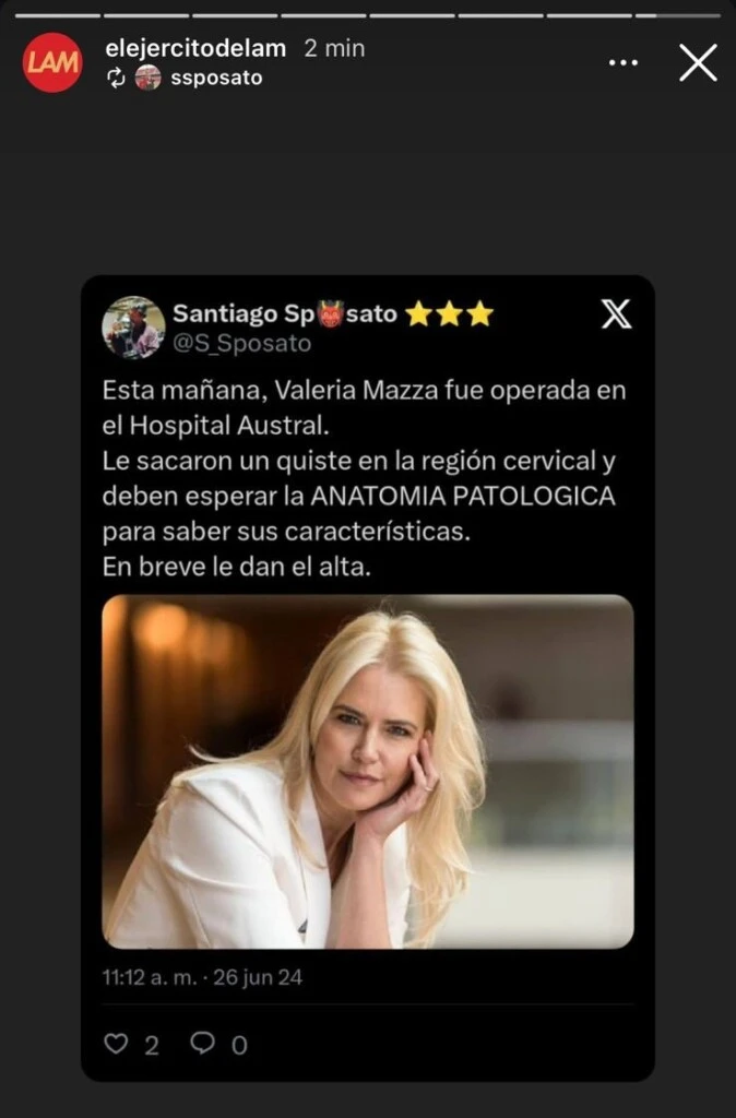 "Esta mañana, Valeria Mazza fue operada en el Hospital Austral. Le sacaron un quiste en la región cervical y deben esperar la ANATOMIA PATOLÓGICA para saber sus características. En breve le dan el alta", compartió Sposato en su cuenta de X (ex Twitter), y, luego, en sus historias de Instagram.