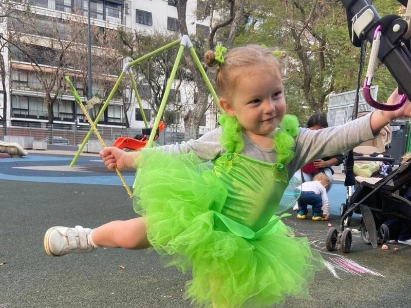 Esta semana, la pequeña salió a un parque de la ciudad acompañada por su abuelo paterno, y disfrutó de su espectacular traje de Tinker Bell, con falda tutú, moños del mismo tono y hasta una varita mágica.