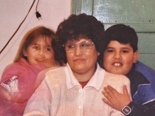 En la foto, se ve a una niña, abrigada con una campera rosa, recostada con cariño sobre una mujer -su abuela-, que posa con una leve sonrisa y una mirada cómplice. Del otro lado, un niño -Costa, en su versión infantil- la abraza con ternura, luciendo una sonrisa amplia y genuina, con un reloj digital en la muñeca que parece marcar otro tiempo, más lento, más cálido.