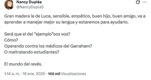 Durante la madrugada del viernes, Nancy Dupláa fue la primera en salir al cruce. Desde su cuenta de X, defendió a su hijo y apuntó contra el periodista con un mensaje que combinó orgullo y reproche: “Gran madera la de Luca, sensible, empático, buen hijo, buen amigo, va a aprender a manejar mejor su lengua y estaremos para ayudarlo”. Luego, ironizó sobre la actitud de Feinmann: “¿Será que el del ‘ejemplo’ sos vos? ¿Cómo? ¿Operando contra los médicos del Hospital Garrahan? ¿O maltratando estudiantes? El mundo del revés”.