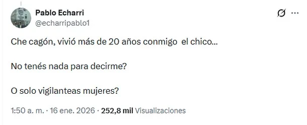 Minutos después, Pablo Echarri endureció aún más el tono y respondió directamente al conductor de Radio Mitre. “Che, cagón, vivió más de 20 años conmigo el chico… ¿No tenés nada para decirme? ¿O solo vigilanteás (sic) mujeres?”, escribió el actor, interpelándolo de forma directa.