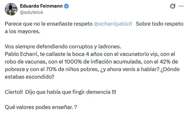 Lejos de bajar el conflicto, Feinmann volvió a responder y redobló la apuesta. “Parece que no le enseñaste respeto Pablo Echarri. Sobre todo, respeto a los mayores. Vos siempre defendiendo corruptos y ladrones”, retrucó.