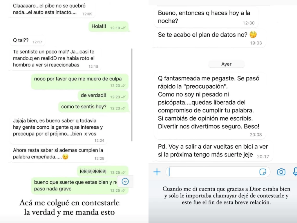 Finalmente, Gonet le pidió el número al joven con la única intención de saber cómo seguía. Si bien se encontraba perfecto, quedó con ese shock de culpa por haberlo golpeado con la puerta de su auto. Sin embargo, solo se encontró con mensajes del chico insistiendo para tener una cita, así que su decisión fue no contestarle más y guardó los mensajes como una anécdota divertida que quiso compartir.