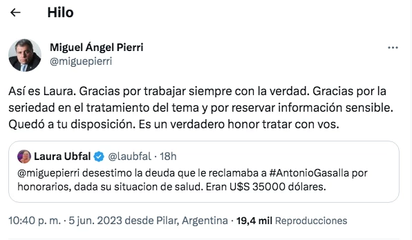 Otra información llamativa que surgió en el día de ayer, durante la emisión de Intrusos (América) es que el abogado Miguel Ángel Pierri le reclamaba a su amigo y cliente la suma de 35 mil dólares. Sin embargo, se trataba de un reclamo viejo que el letrado decidió olvidar. Al menos, así dejó entrever en su cuenta de Twitter, al mismo tiempo que le agradeció a Laura Ubfal la información precisa que compartió.