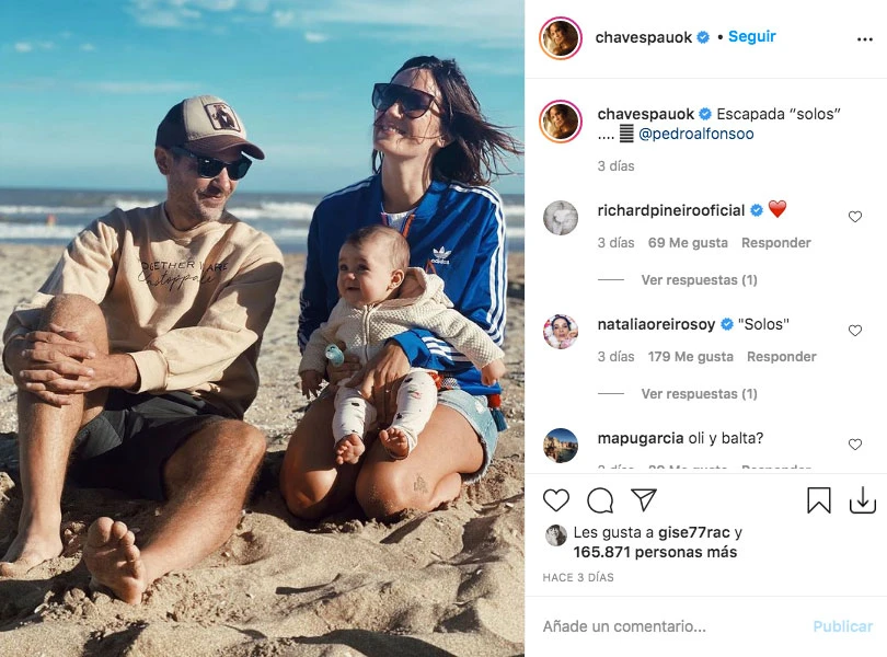 Fue la modelo y conductora quien desde Instagram puso con picardía: "Escapada 'solos'.... @pedroalfonsoo". En la imagen se ve a Pedro sentado en la arena y a Paula con Fili a upa.