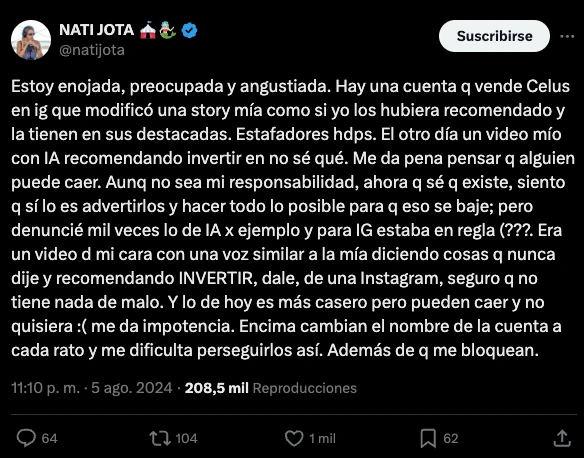 "Hicieron un video con Inteligencia Artificial con mi cara, mi voz mal hecha, era neutro como hablaba esa chica falsa, inexistente. Y decía 'Inviertan plata acá', con un link, y encima una historia promocionada que le aparecía a personas que ni me seguían. Un horror", expresó indignada.