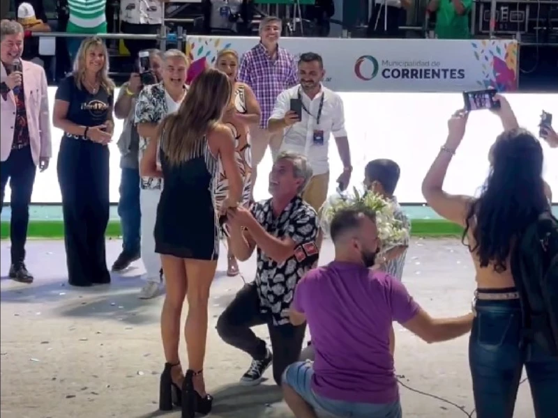 "Bueno mi amor, en este momento tan importante, acá en los carnavales, en el lugar que a vos tanto te gusta... ahí están tus papás, tu hermano, Valentín. Espero que salga bien... acá tengo un anillo. Quiero decirte que te amo y te quiero preguntar si te querés casar conmigo. Me voy a arrodillar", dijo el Chato, un poco nervioso y entre risas.
