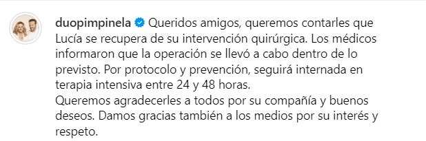"Queridos amigos, queremos contarles que Lucía se recupera de su intervención quirúrgica", fueron las primeras palabras del escrito en cuestión. "Los médicos informaron que la operación se llevó a cabo dentro de lo previsto. Por protocolo y prevención, seguirá internada en terapia intensiva entre 24 y 48 horas", estimaron.