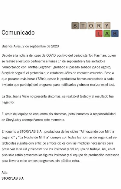 "Debido a la noticia del caso de COVID positivo del periodista Toti Pasman, quien se realizó el estudio pertinente el lunes 1° de septiembre y fue invitado a Almorzando con Mirtha Legrand, grabado el pasado sábado 29 de agosto, StoryLab seguirá el protocolo que establece 48 hs. de contacto estrecho. Pese a que pasaron más horas (72 hs.), desde la productora hemos contactado a cada invitado que participó del programa para notificarlos y ofrecer realizarles el test", comienza el texto.