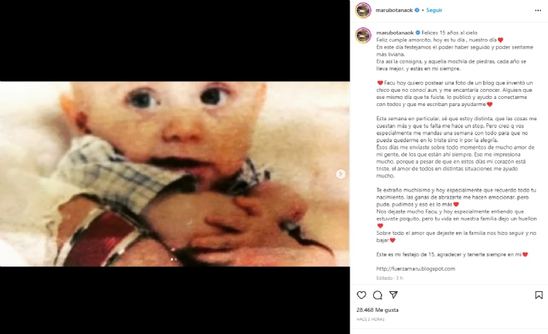 Por último, Maru Botana cerró diciendo: “Sobre todo, el amor que dejaste en la familia nos hizo seguir y no bajar. Este es mi festejo de 15, agradecer y tenerte siempre en mi corazón”. En septiembre de 2008, la cocinera se tomó unos días de vacaciones en la montaña y dejó a Facundo al cuidado de su abuela, quien halló al pequeño sin vida en una habitación en la que estaba durmiendo.