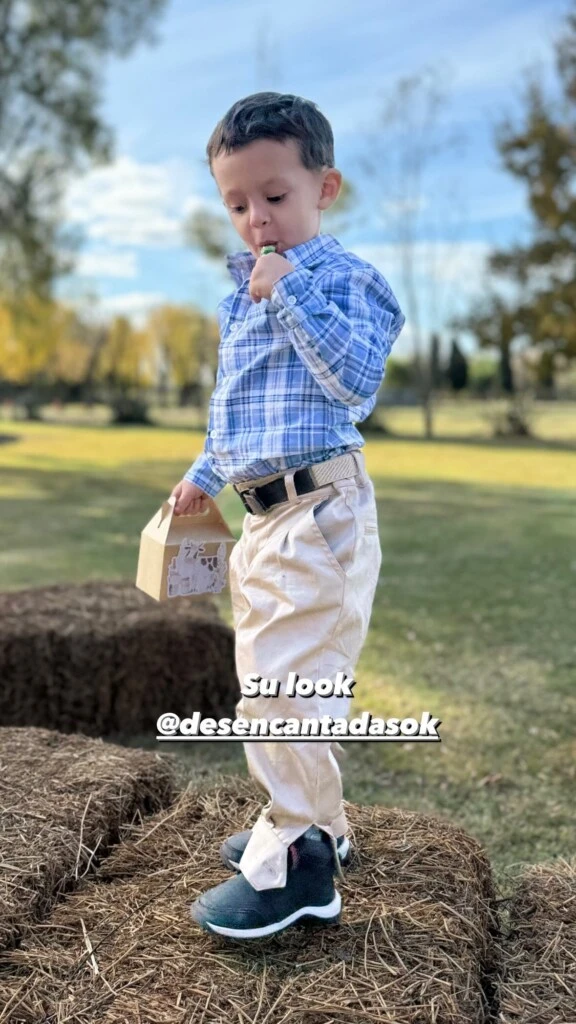 En línea con la temática, toda la familia vistió atuendos típicos. Noelia lució una bombacha de campo de tela gabardina gamuzada color beige, con un suéter tejido blanco y una típica boina color gris. El cumpleañero por su parte lució una bombacha de campo similar, pero color blanca y una camisa tipo cuadrille con tonos azules y celestes.