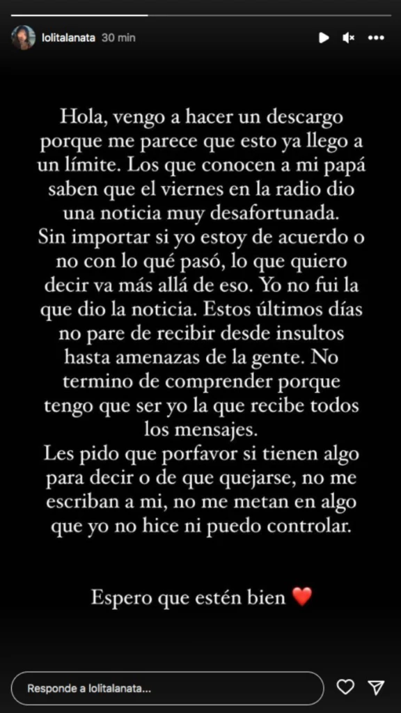 “Hola, vengo a hacer un descargo porque me parece que esto ya llegó a un límite. Los que conocen a mi papá saben que el viernes en la radio dio una noticia muy desafortunada. Sin importar si yo estoy de acuerdo o no con lo que pasó, lo que quiero decir va más allá de eso", adelantó al principio de sus palabras.