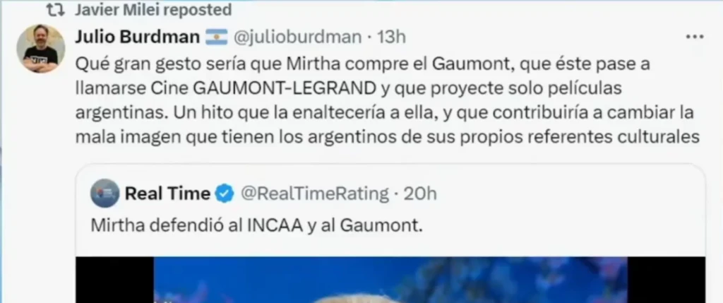 Después de que la conductora se mostrara en contra del cierre del mítico cine Gaumont, el presidente de la Nación la invitó, a través de un retweet en X, a que lo compre con su dinero. Luego, La Chiqui manifestó cierto temor a la hora de expresarse, ya que consideró "ridícula" la propuesta de Milei.