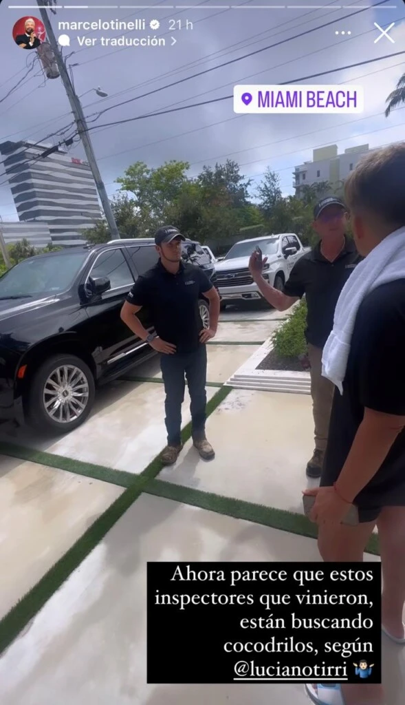 Posteriormente, ya dentro de la casa, Marcelo grabó otra historia en la que se los veía a los hombres caminando alrededor de la casa, pasando para el jardín. "Están buscando cocodrilos en casa", comentó el famoso conductor, y escribió: "Estos señores siguen tomando medidas en la casa, y según el Tirri intentan medir el tamaño de los cocodrilos".