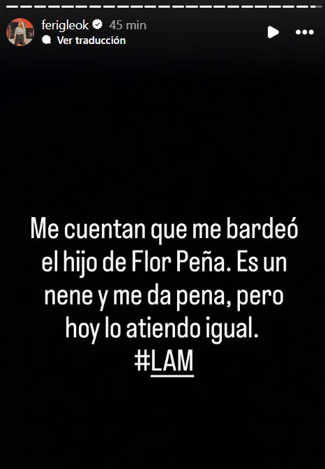 Ante esto, Fernanda Iglesias salió al cruce y le respondió al hijo de Flor en sus historias de Instagram. "Me cuentan que me bardeó el hijo de Flor Peña. Es un nene y me da pena, pero hoy lo atiendo igual. #LAM", sentenció la panelista del ciclo de América TV.