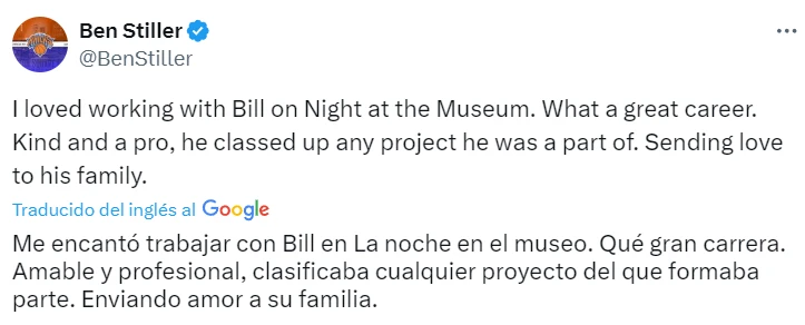 "Me encantó trabajar con Bill en Una noche en el museo. Qué gran carrera. Amable y profesional, clasificaba cualquier proyecto del que formaba parte. Envío amor a su familia", escribió eso en su cuenta de X.