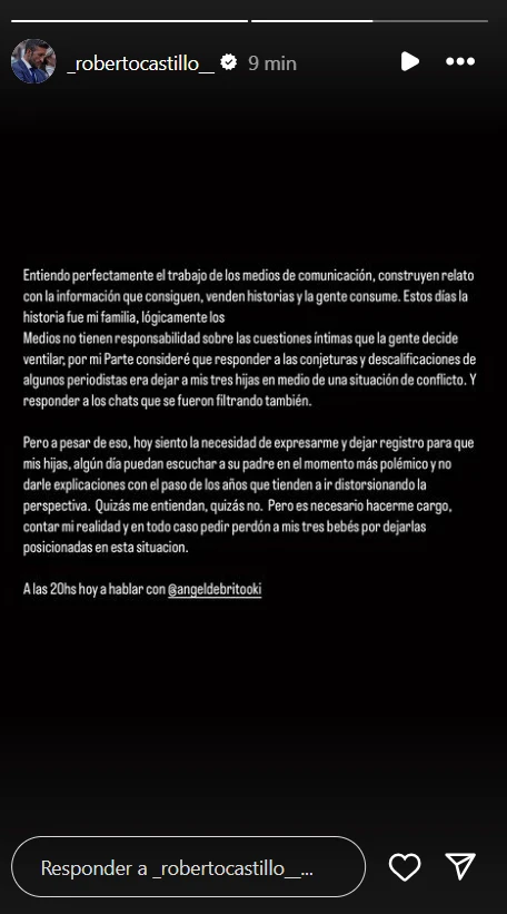 "Entiendo perfectamente el trabajo de los medios de comunicación, construyen relato con la información que consiguen, venden historias y la gente consume", comenzó diciendo Roberto Castillo en una historia que subió este miércoles a su cuenta de Instagram.