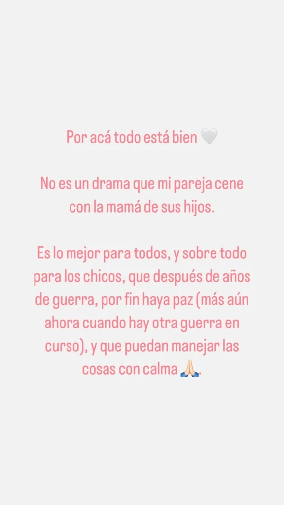 Luego de esa referencia sobre el vínculo de Maxi y Wanda, quienes estuvieron casados 5 años y tienen 3 hijos en común, Valentino, Constantino y Benedicto, la novia del exfutbolista expresó: "Es lo mejor para todos, y sobre todo para los chicos, que después de años de guerra, por fin haya paz, más aún ahora cuando hay otra guerra en curso, y que puedan manejar las cosas con calma".