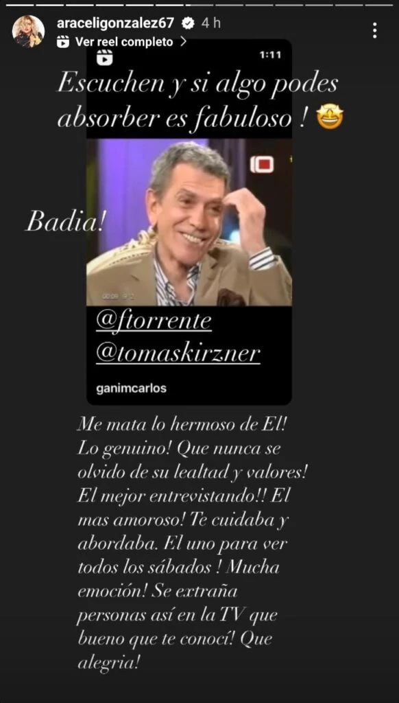 Araceli aprovechó este posteo para recordar al flamante conductor:"Me mata lo hermoso y genuino de él. Nunca se olvidó de su lealtad y de los valores. El mejor y más amoroso entrevistando. Te cuidaba y abordaba. El uno para ver todos los sábados. Mucha emoción".