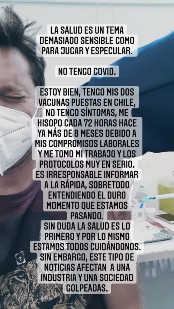 Para llevar más tranquilidad a sus seguidores, Vicuña publicó una fotografía del momento en el que recibió la vacuna en Chile y aclaró su situación: "La salud es un tema demasiado sensible como para jugar y especular. No tengo COVID. Estoy bien, tengo mis dos vacunas puestas en Chile, no tengo síntomas, me hisopo cada 72 horas hace ya más de ocho meses debido a mis compromisos laborales, y me tomo mi trabajo y los protocolos muy en serio".