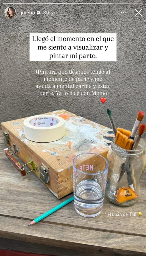 A través de sus historias de Instagram, Jimena compartió una imagen en la que se puede ver una valija de madera toda pintada, unas brochas, un lápiz, una cinta y unos vasos. Sobre la foto, la cantante reveló: "Llegó el momento en el que me siento a visualizar y pintar mi parto".