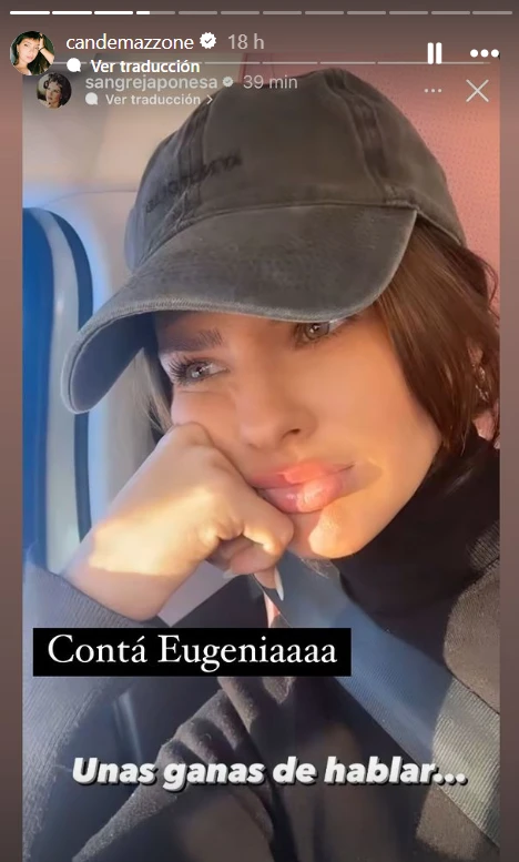 Lo cierto es que, minutos después de publicar esa historia, la actriz, cantante e influencer decidió borrarla. Pero la periodista Cande Mazzone fue más rápida que ella, logró capturarla y la compartió con sus seguidores. "Contá Eugenia", le pidió Mazzone a Suárez en su posteo. ¿Lo hará?