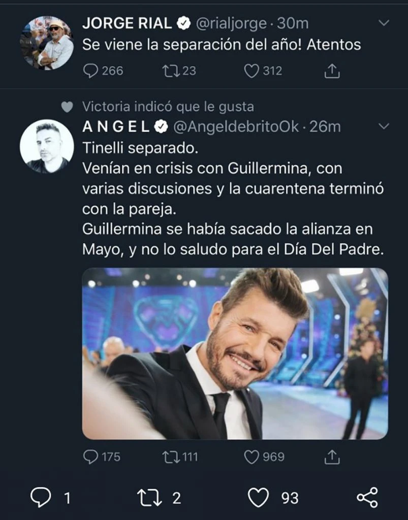 Lo cual tiene cierto sentido, porque Marcelo hizo pública la noticia a las 11:04. Es decir, en simultáneo con el posteo enigmático de Jorge y cuatro minutos antes del posteo de Angel. Y fue a las 11:10 que Jorge publicó "Se separó @cuervotinelli".