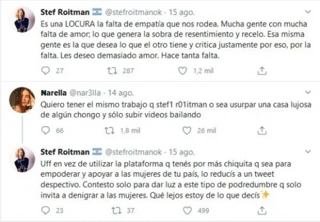 Y ahora, la también influencer celebró en sus redes que alcanzó los dos millones de seguidores en su perfil de Instagram y recibió un duro comentario en Twitter: "Quiero tener el mismo trabajo que Stefi Roitman, o sea usurpar una casa lujosa de algún chongo y solo subir videos bailando", escribió una usuaria, que contó con más 26 mil likes.