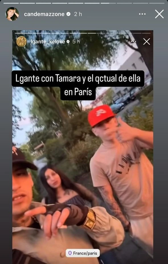 "L-Gante con Tamara y el actual de ella en París", comentó la periodista Cande Mazzone al compartir la historia en la que se los veía a los tres caminando juntos por la ciudad francesa.