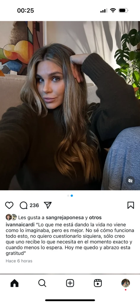En detalle, Ivana compartió un posteo en sus redes sociales, donde tiene casi 1 millón de seguidores, y escribió: “Lo que me está dando la vida no viene como lo imaginaba, pero es mejor. No sé cómo funciona todo esto, no quiero cuestionarlo siquiera, sólo creo que uno recibe lo que necesita en el momento exacto y cuando menos lo espera. Hoy me quedo y abrazo esta gratitud”. Esta publicación fue acompañada con una selfie de ella.