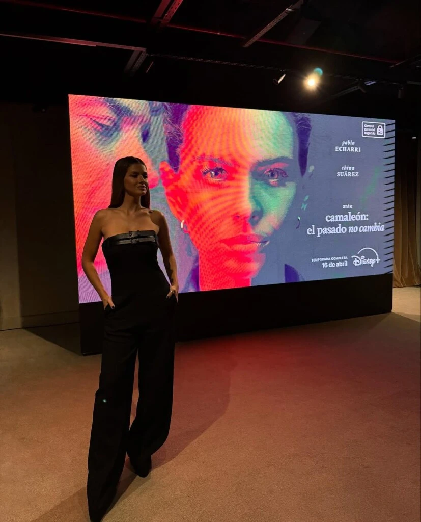 "Fin proyección primer capítulo de #Camaleón. Ya falta menos", escribió Suárez arriba de ese posteo en el que agregó un emoji de carita enamorada. En la foto se puede ver el outfit que eligió la actriz para este momento tan importante, que fue total black, con un pantalón ancho y un top tipo strapless, que tenía unos cinturones de cuero en la parte superior.