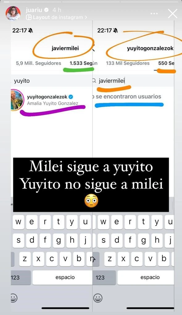En este contexto, Juariu descubrió que González dejó de seguir a Milei, mientras que él aún la sigue en Instagram. Para confirmarlo, subió a sus historias de Instagram imágenes mostrando las redes de cada uno, que demostraban que entre las personas que seguía Javier estaba Yuyito.