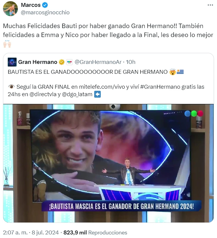 "¡Muchas felicidades Bauti por haber ganado Gran Hermano! También felicidades a Emma y Nico por haber llegado a la final, les deseo lo mejor", escribió el ganador del reality el año pasado desde su cuenta de X.