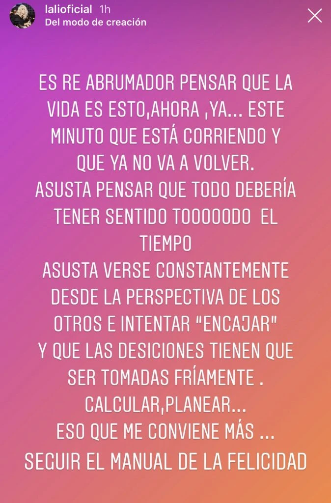 Reflexiva y después de una siesta, Lali (28), en el que, misteriosa, escribió "estoy cansada, porque... ¡no saben lo que estuve rodando!", publicó una serie de frases que hilan sus pensamientos basados en el sentido de la vida, el miedo de existir ajustado a la mirada de los demás, y que la energía y la luz es lo único que tenemos, lo demás "es supervivencia". ¿Qué opinás?