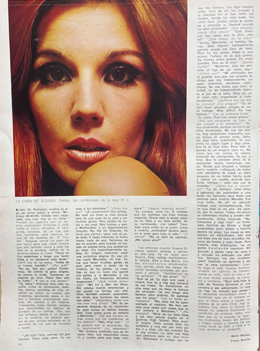 "Susana Giménez está aquí para que la contemplemos en pleno shock y para que nos enteremos de opiniones, hechos, fechas y nombres de su mundo. Para leer, mirar, recordar”, adelantaba el copete de aquella semblanza-entrevista de Mario Mactas publicada en el 18 de junio de 1970, ilustrada por imágenes del no menos legendario fotógrafo Oscar Burriel, que acompañaban tres recuadros con tres poses y otros tantos textos: