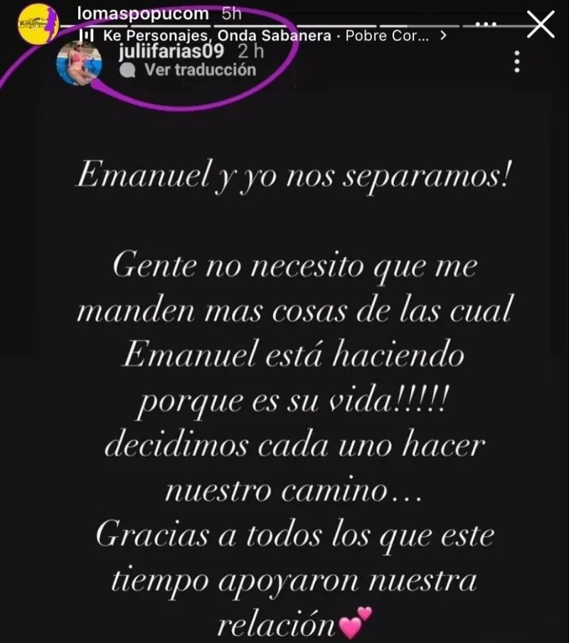 Apenas días después del compromiso, Julieta Farías confirmó la ruptura con el cantante de Ke Personajes: "Emanuel y yo nos separamos. No necesito que me manden más cosas de las cuales Emanuel está haciendo, porque es su vida. Decidimos cada uno hacer nuestro camino. Gracias a todos los que este tiempo apoyaron nuestra relación", afirmó la exnovia del músico.